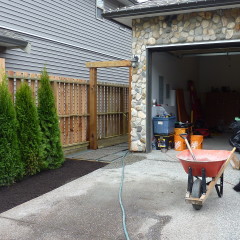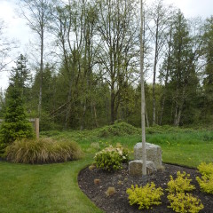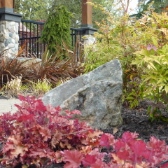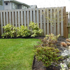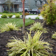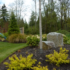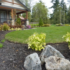 We fixed the drainage issues, installed natural rock retaining features, designed the beds and finsihed with plants and lawn.